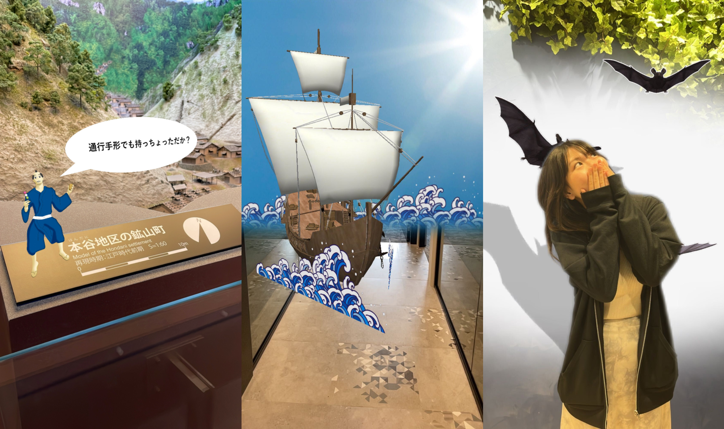石見銀山で金銀鉱を採掘していた作業員(銀堀/かねほり)がARにより現実世界に現れるフィルターをはじめとし、全3種類のSNSフィルターです。Instagram・Facebookアプリがインストールされたスマートフォンから、以下のURLに遷移いただくことでどなたでもご利用いただけます。